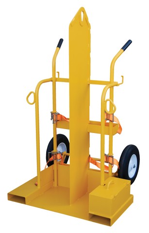 Vestil is an industry leader in manufacturing industrial material and various tool shop handling equipment. These products can increase productivity improve workplace ergonomics and decrease worker injury. The Welding Cylinder Torch Cart is designed for transporting cylinders and cutting torch. Includes two tank compartments with heavy-duty ratchet straps. Brackets are included for holding cutting torch and hose. Sturdy handles and large wheels for tilt-n-go portability. Convenient open-top storage tray. This unit includes lockable storage box for regulators. Box includes hose opening so regulator does not need to be disconnected for storage. Overhead lift eye. Fork pockets for transportation. Unit has fire protection Marinite 1 / one material which provides a thirty / 30 minute fire protection barrier as prescribed by OSHA standards 1910.253 and 1926.350. Welded steel construction with painted finish. Not designed for use as a storage means for gas cylinders. Specifications